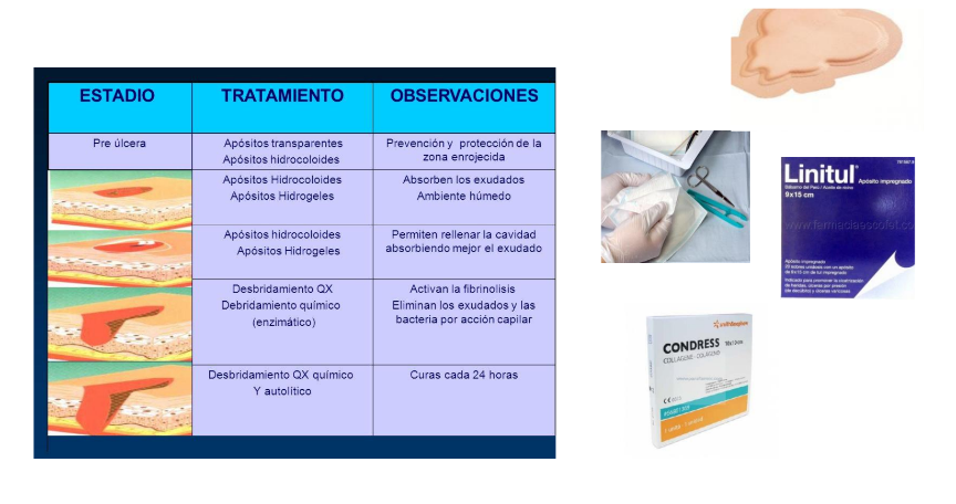 Aliviar la presión, limpieza con suero salino fisiológico, apósito hidrocoloide para cura húmedo, cambiar apósito cada 48H, si es grande gel hidrocoloide.