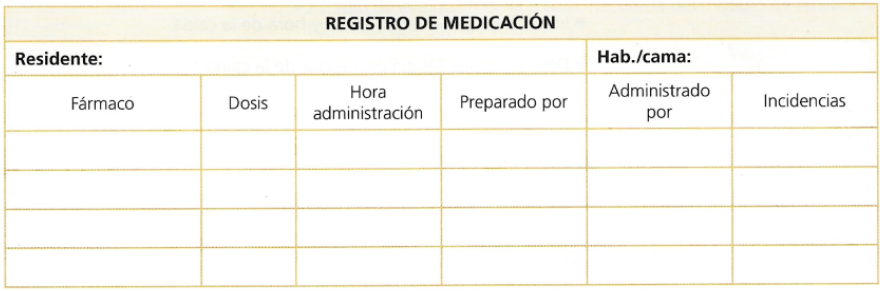 La normativa exige que los centros residenciales mantengan un registro de la medicación administrada a cada usuario, incluyendo quién la administra. Este registro debe contener: