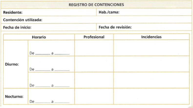 Recuerda que las contenciones solo deben realizarse en aquellas situaciones prescritas por el facultativo, y se indicarán el tiempo de contención y las pautas para aplicarlas. El registro reflejará que todo este protocolo se realiza según los procedimientos previstos, por lo que deberá contener los datos siguientes: