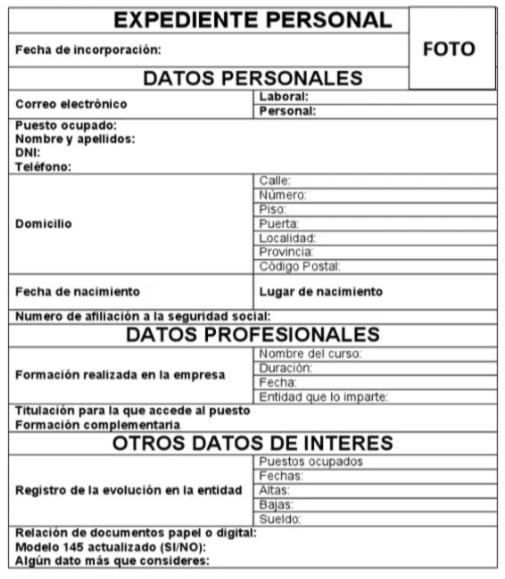 Cada centro dispondrá de un modelo de ficha específica, pero la información mínima que debe aparecer es la siguiente: número de expediente, nombre y apellidos, fecha de alta, doctor o doctora responsable y tarifa acordada.